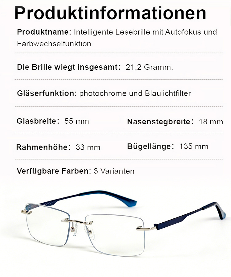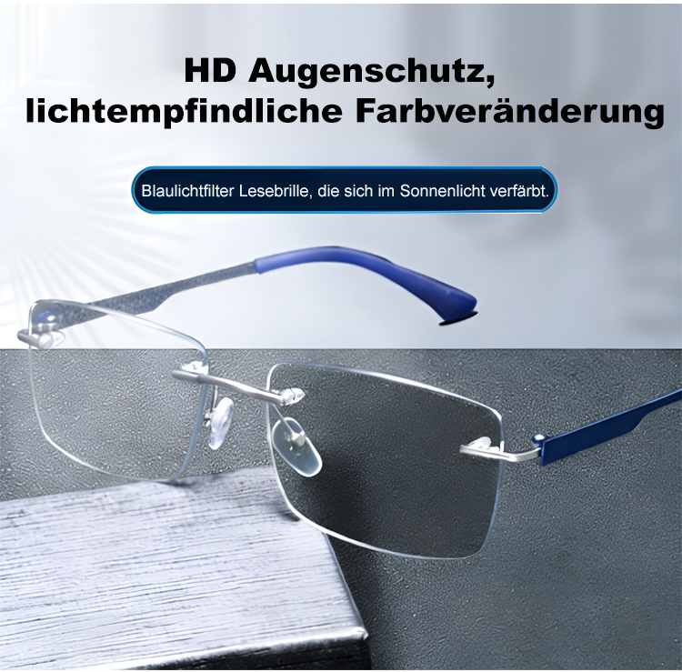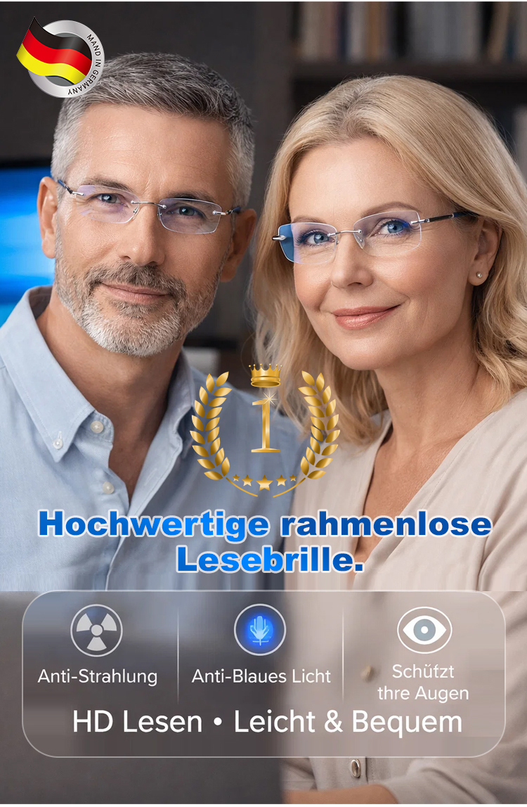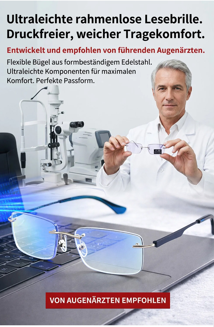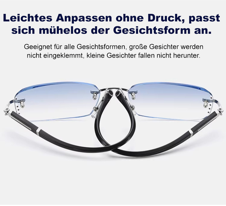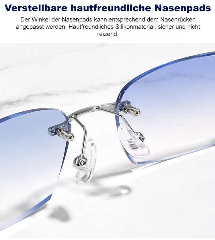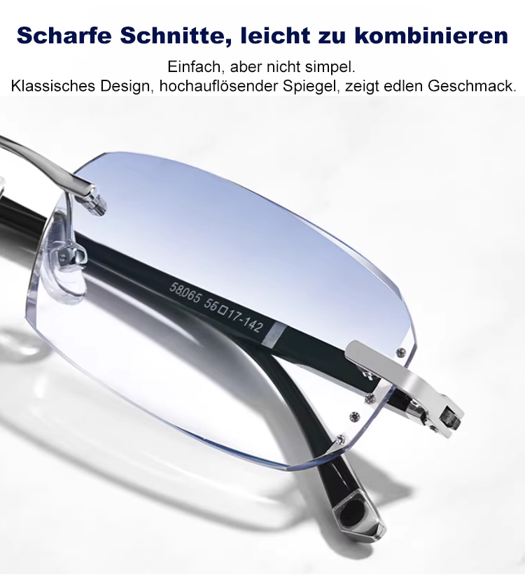 Eine rahmenlose, hochwertige Lesebrille mit diamantgeschliffenen Kanten im klassischen Design, die f